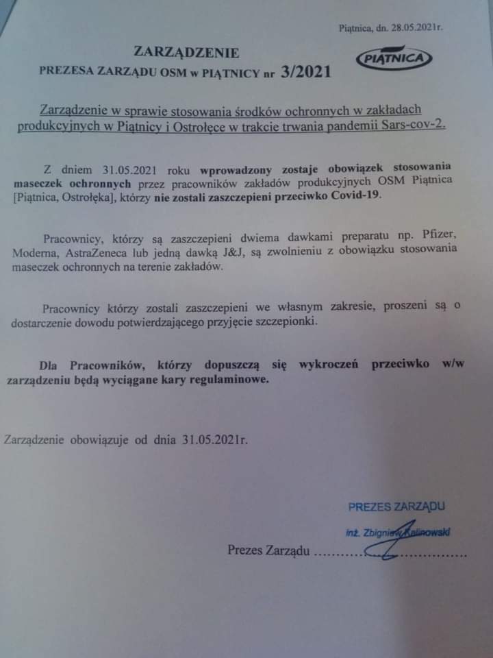 W firmie Piątnica produkującej między innymi śmietanę (przestańcie kupować ją z tej firmy, szczególnie jeżeli nie chcecie jeść koronawirusa!) i inne produkty nabiałowe, prezes zarządu Zbigniew Kalinowski będący na bakier z prawem (m.in. zastraszanie karami regulaminowymi) i lubiący dyskryminować pracowników wydał rozkaz, że nosić maskę mają tylko osoby niezaszczepione (namawiamy pracowników firmy Piątnica do masowego składania pozwów do Sądu Pracy, niezależnie od statusu zaszczepienia – dowody są tutaj w linku, a inni pracownicy mogą posłużyć jako świadkowie). Jest to niezgodne nie tylko z polskim prawem, ale również jest niezgodne z obowiązującą wiedzą medyczną, bowiem udowodniono, że osoby szczepione nadal mogą być nosicielami koronawirusa, a nawet chorować. W pozwie warto zadać pytanie na jakiej podstawie prawnej prezes zarządu i jego firma przetwarza dane osobowe z kategorii artykułu 9 RODO (dane o zdrowiu i seksualności pracownika). Skargę warto też wnieść do UODO z prośbą o przeprowadzenie kontroli w zakresie przetwarzania danych z zakresu art. 9 RODO w Okręgowej Spółdzielni Mleczarskiej w Piątnicy (KRS: 0000115527).