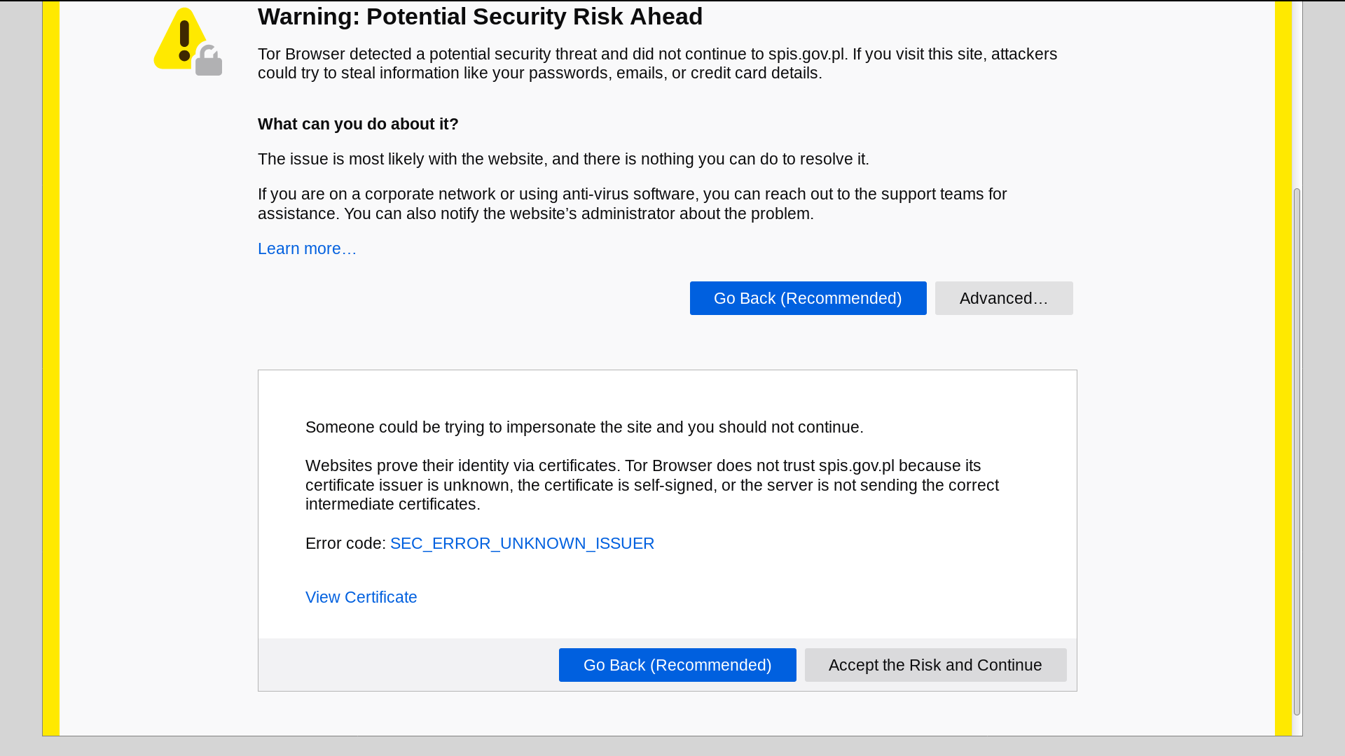 - niemożność skorzystania ze strony lub obawa o wykradnięcie tożsamości (ustawodawca nie podał wspieranych przeglądarek) – taki komunikat dawała przeglądarka Tor Browser w czasie trwania spisu i wciąż (2021‑10‑09) ten komunikat widnieje,