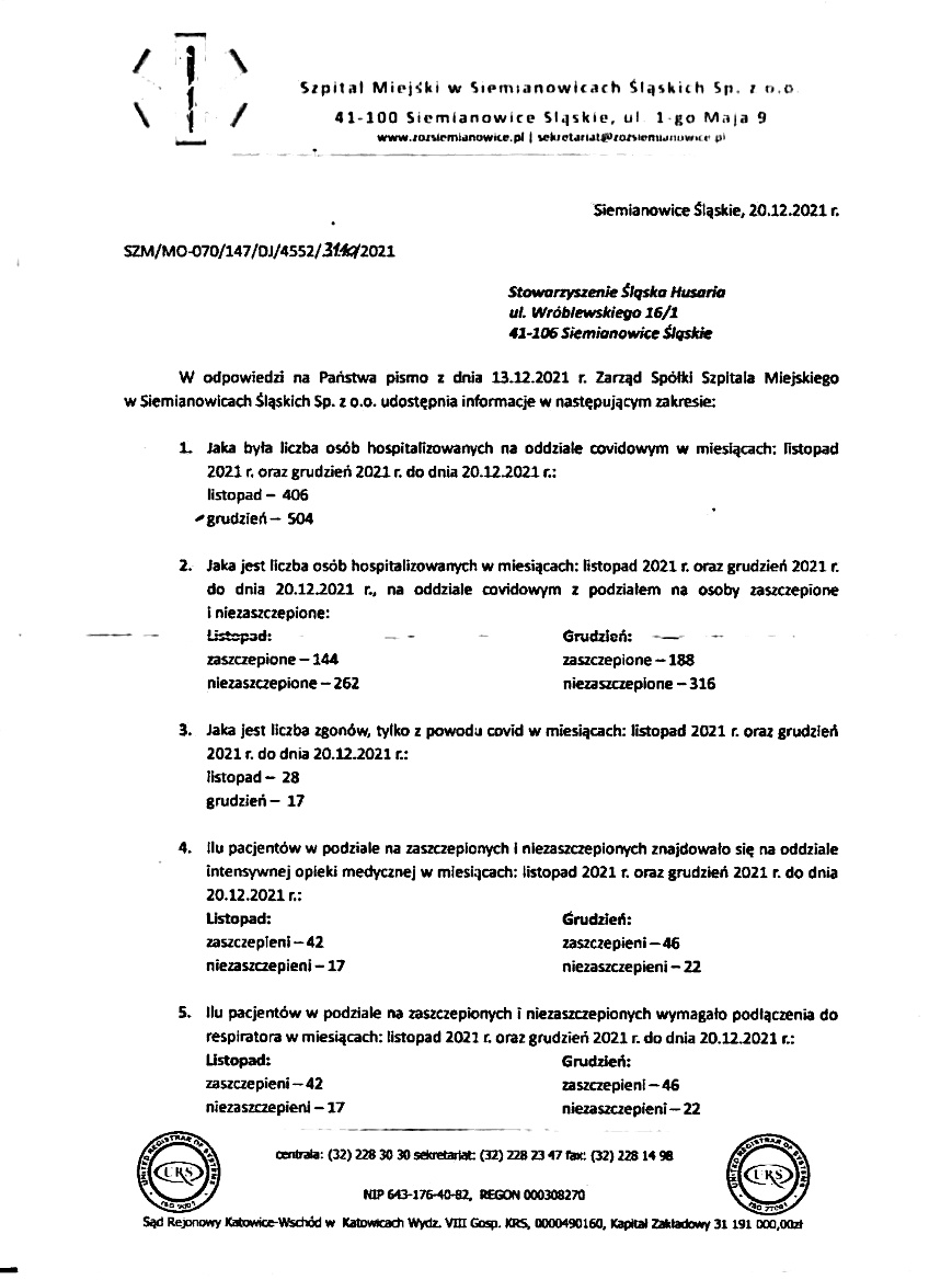 Porównanie ilości osobodni hospitalizacji w Polsce w latach 2019 i 2020. Miesiąc Rok 2019 Rok 2020 Styczeń 5786509 5571037 Luty 5328313 5377179 Marzec 5852016 4559473 Kwiecień 5390640 3182501 Maj 5620190 3838694 Czerwiec 5409384 4311678 Lipiec 5566806 4729791 Sierpień 5369650 4660518 Wrzesień 5360889 4692705 Październik 5627605 4233661 Listopad 5332917 3416971 Grudzień 4599413 3247360 COVID jest od minimum roku akcją psychologiczną. Prawdziwa groźna epidemia nie wymaga przypominania codziennie we wszystkich mediach, że mamy epidemię. Dodatkowo z danych z zapytania o informację publiczną wynika, że o 1/3 spadła ilość osobodni (suma ilości godzin poświęconych kolejnym osobom) w szpitalach w latach 2020–2021 w stosunku do roku 2019. Wynika to po części z zastraszenia obywateli i unikania hospitalizacji z powodu innych chorób (bali się wirusa) i następowej śmierci z powodu tych chorób. Dodatkowo stan taki wynika z faktu przekształcenia szpitali w szpitale kovidowe, które nie były dostępne dla wymagających pomocy (karetki z pacjentem z zawałem czekały godzinami).